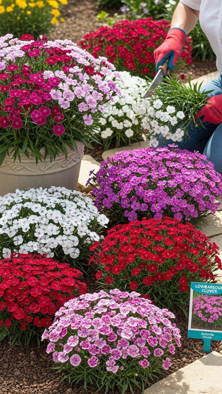 Plant dianthus for neat, long-blooming clumps of fragrant, frilly flowers that suit rock gardens, borders, and containers. You’ll enjoy low-maintenance growth, sun-loving habits, and drought tolerance once established. Choose fragrant varieties for cut bouquets and close-up scent. Deadhead spent blooms to encourage more flowering.