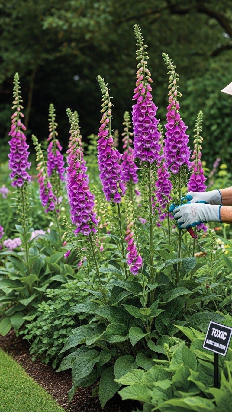 Foxglove (Digitalis) brings tall, elegant spires of tubular blooms that suit shaded or part‑sun borders and cottage gardens, but handle them with care — all parts of the plant are toxic if ingested.