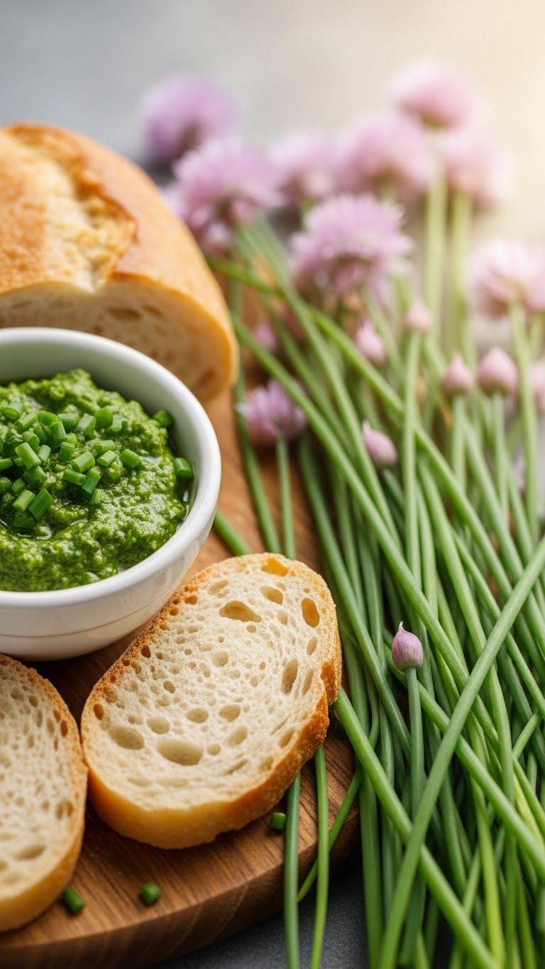 You blitz bulbs and blossoms into chive pesto, bright and herbaceous, then smear it over warm bread, letting freedom’s sharp, clean flavor lift every bite.