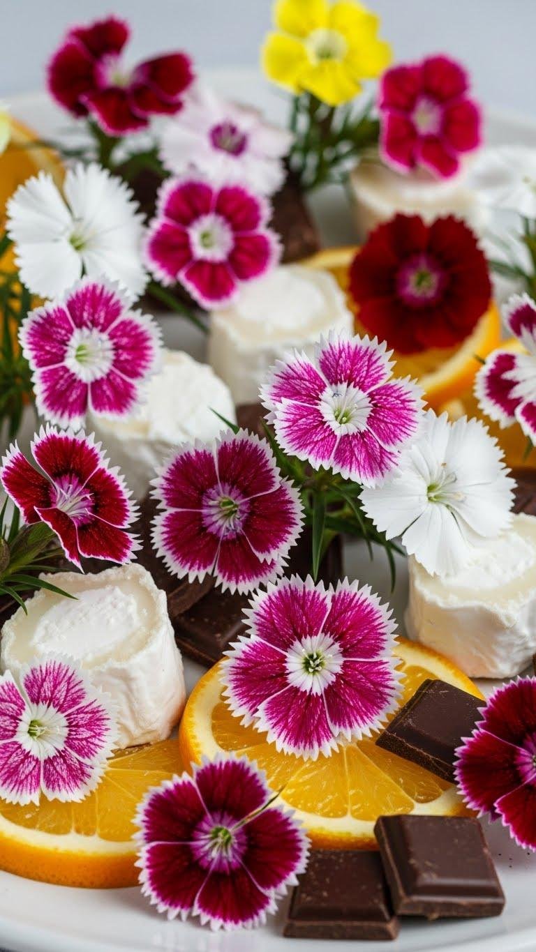 Petals like confetti, dianthus brings a crisp, clove‑like note to salads and confections that’s both bright and slightly spicy—you’ll notice a clean sweetness edged with peppery warmth. You’ll scatter fringed blooms over citrus, goat cheese, or chocolate, experimenting with floral pairings and cent repurposing of stems into syrups. Taste is immediate, vivid, freeing — precise, decorative, and utterly edible.