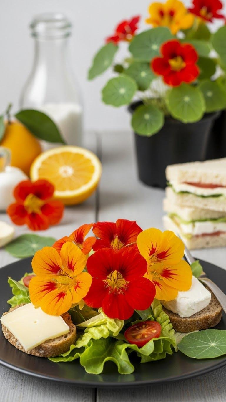 You’ll find nasturtium petals peppered with a bright, peppery bite that livens salads, sandwiches, and soft cheeses.