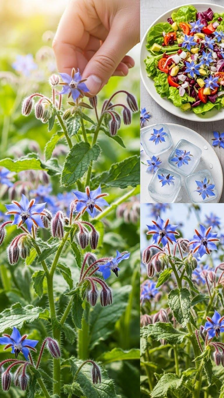 Plucking a star-shaped borage blossom, you’ll notice its cool, cucumber-fresh scent and a crisp, moist texture that snaps gently between your teeth. You’ll plant freely, experimenting with borage cultivation in sunlit beds, watching blue stars dance.