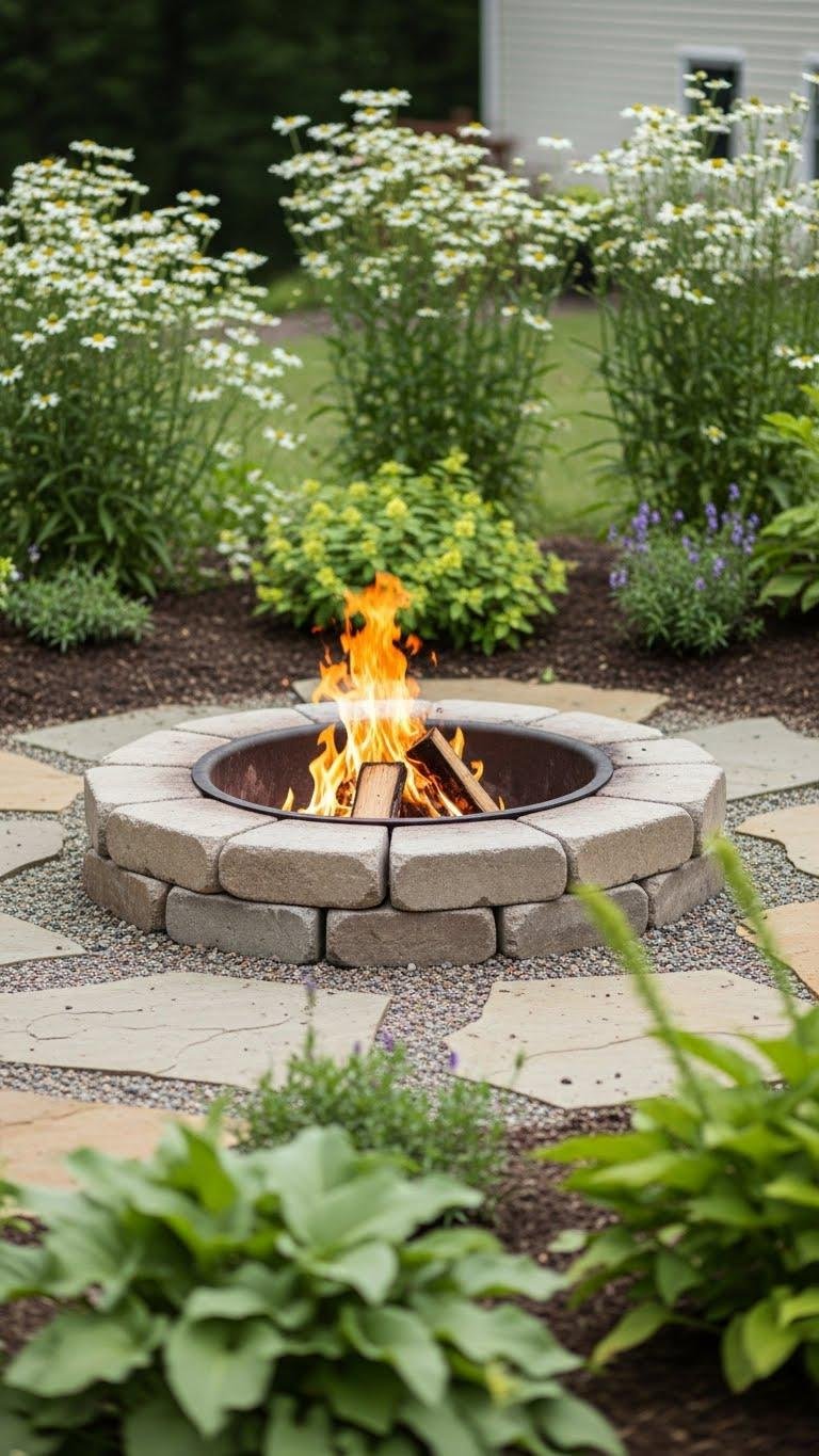 Moving from a low-profile flagstone ring, you can step up to a stacked concrete block fire pit for a more sculpted, durable look that still feels DIY-friendly.