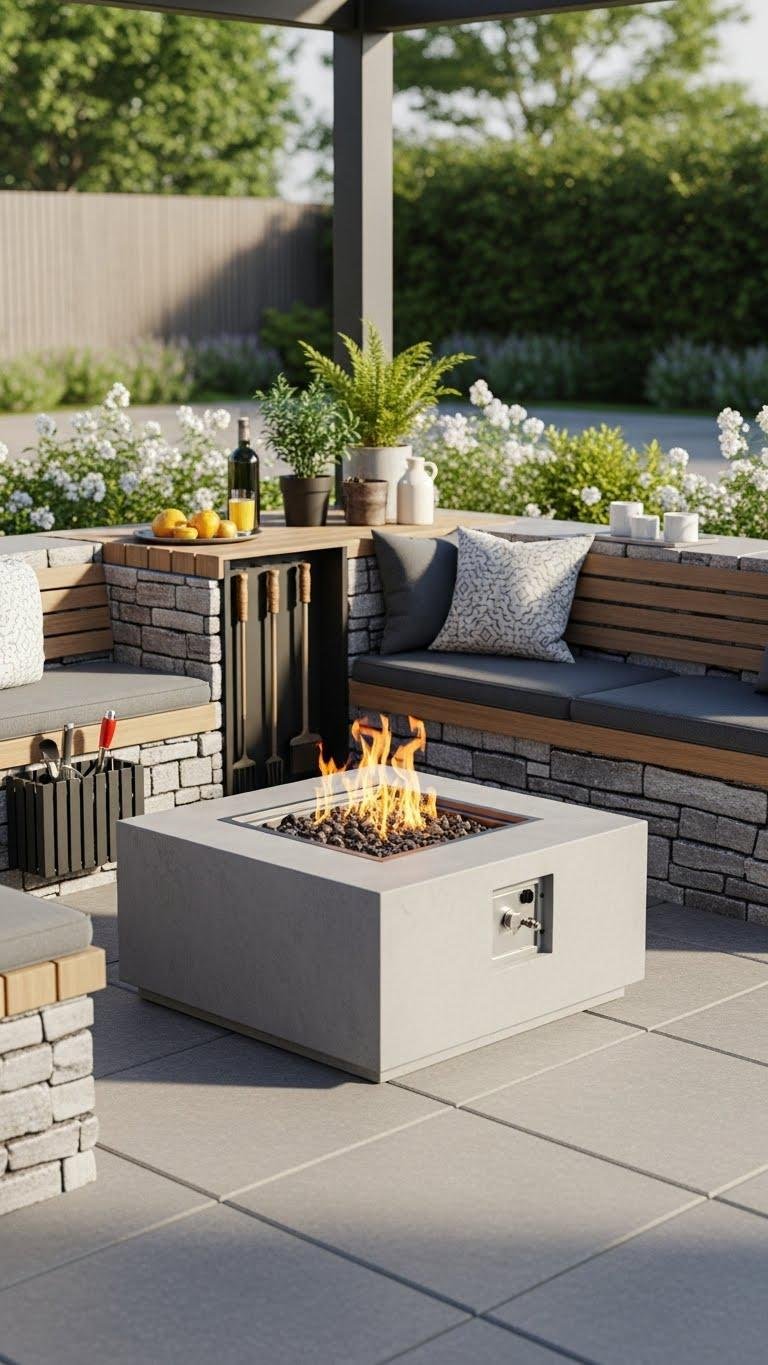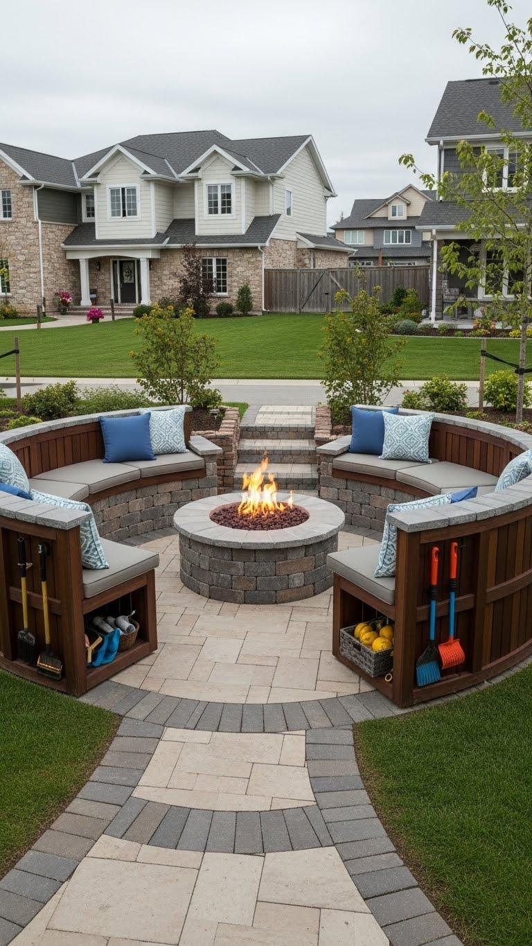 When a fire pit sits at the center of built-in benches, it transforms a yard into a defined gathering space that balances form and function.