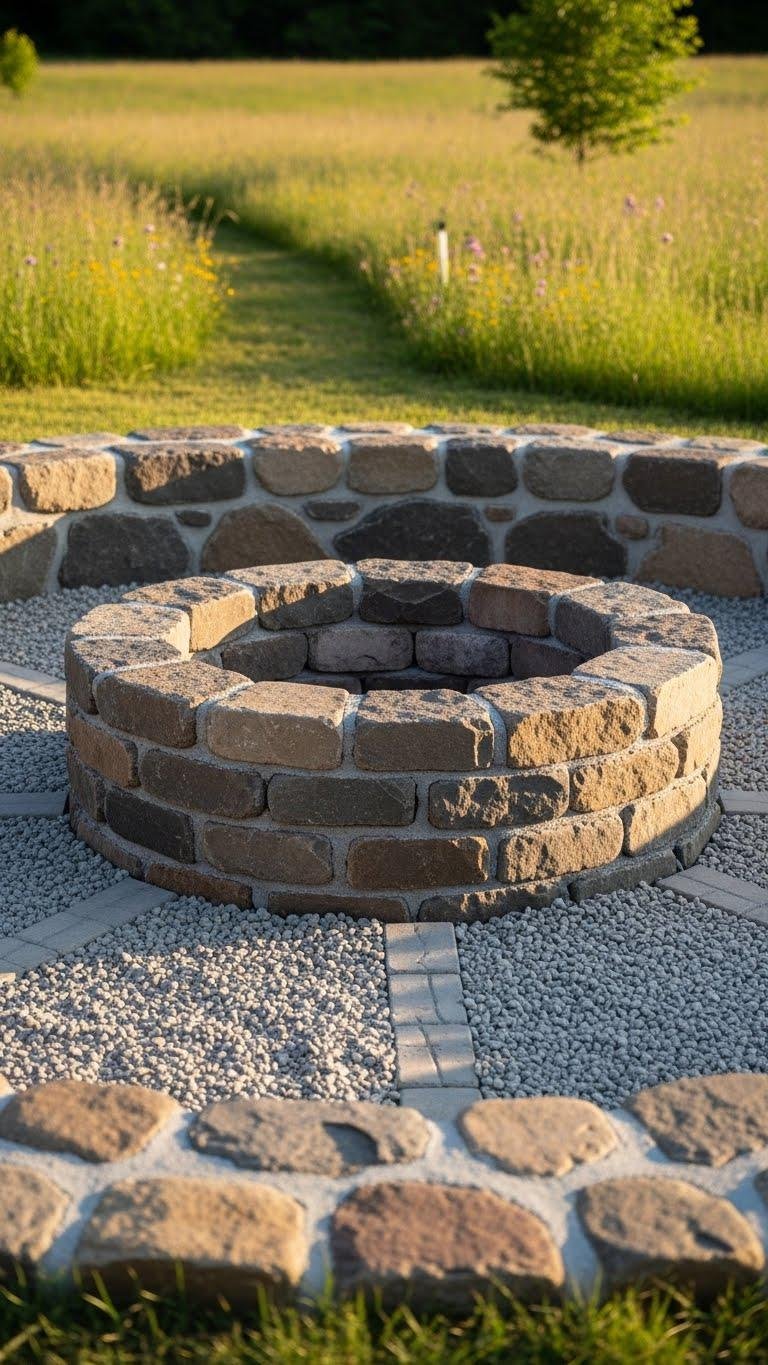 A rustic fieldstone pit anchored on a compacted gravel base gives your yard a sturdy, low-maintenance focal point that blends with natural surroundings.