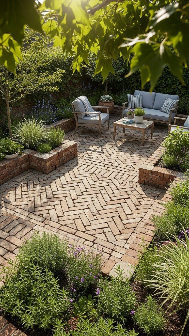 Lay salvaged bricks in a patterned herringbone to create movement, set edges with herbs or grasses, and use permeable jointing so water feeds roots.