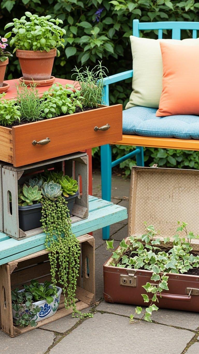 You can hollow a dresser drawer for herbs, stack crates into a bench staircase for cascading succulents, or line a vintage suitcase planter with drainage for trailing ivy.