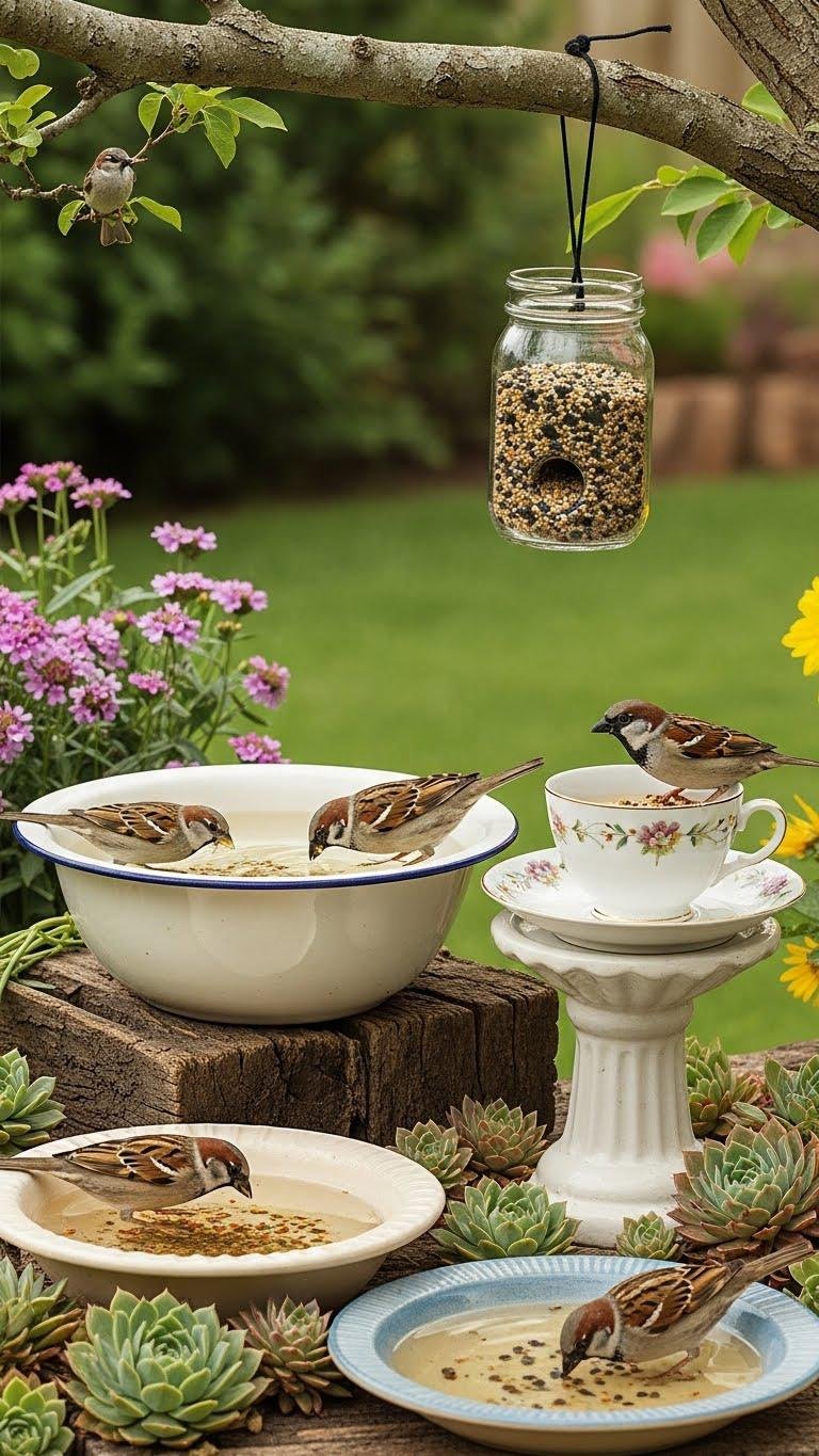 You’ll hang a mason jar seed feeder from a branch, perch a vintage teacup on a pedestal for sipping sparrows, and nestle shallow dishes among succulents.