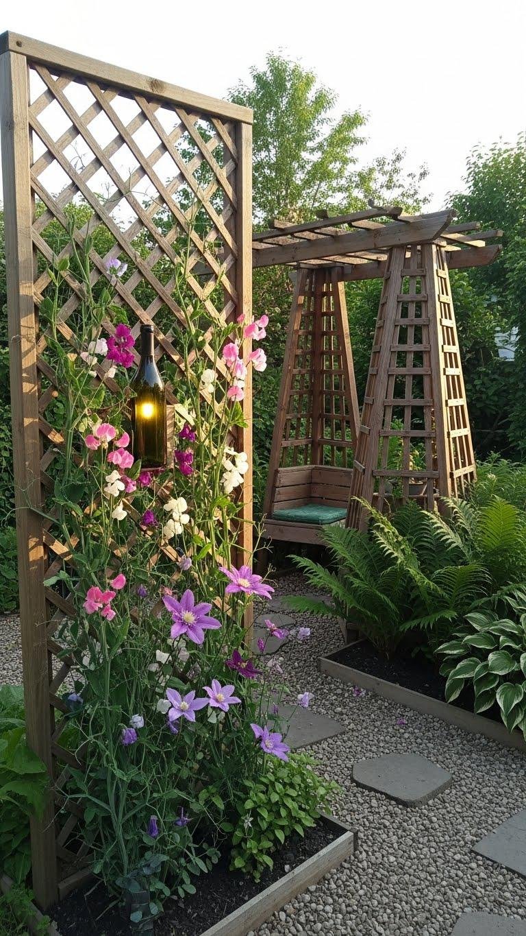 After you’ve welcomed birds with repurposed baths and feeders, use scrap wood to add vertical interest that supports climbing plants and creates shaded nooks. Build a rustic lattice or simple climbing frame for sweet peas and clematis, inset a wine bottle for a light feature, or craft a hinged obelisk for flexible shading.