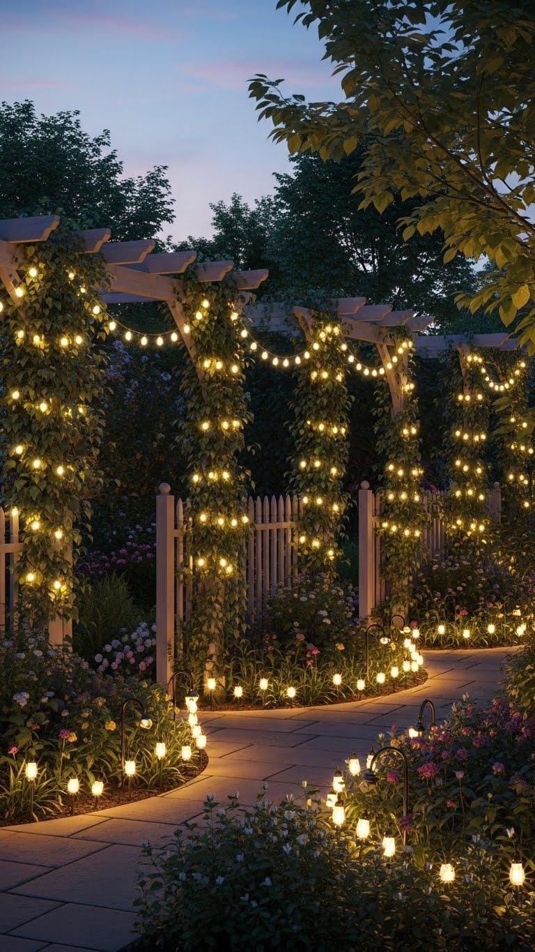 String up solar string lights along pergolas, fences, or through shrub canopies to give your garden soft, plant-flattering illumination after dusk.