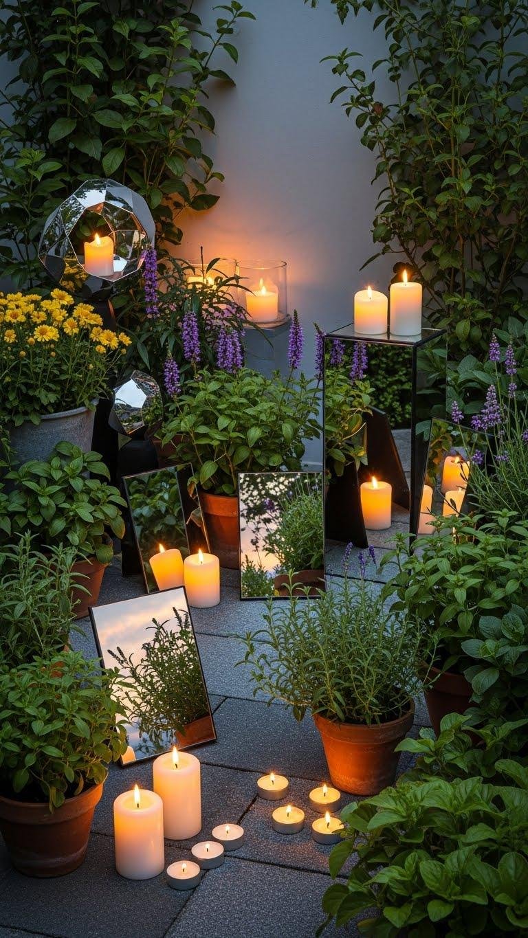 After you’ve set mood with candles and tealights, mirrors and reflective surfaces will multiply that glow and make small pockets of light feel larger. You’ll place mirror mosaics among potted herbs, angle small panels to bounce sunset into shady corners, and add reflective sculptures near foliage.