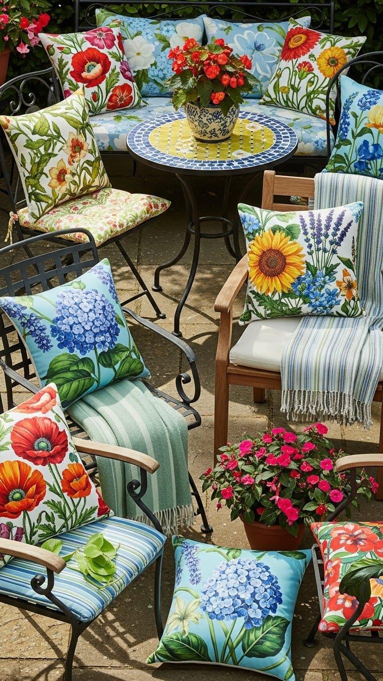 You’ll pick pattern cushions and weatherproof throws that contrast foliage, tie to seasonal blooms, and invite you to linger outdoors.