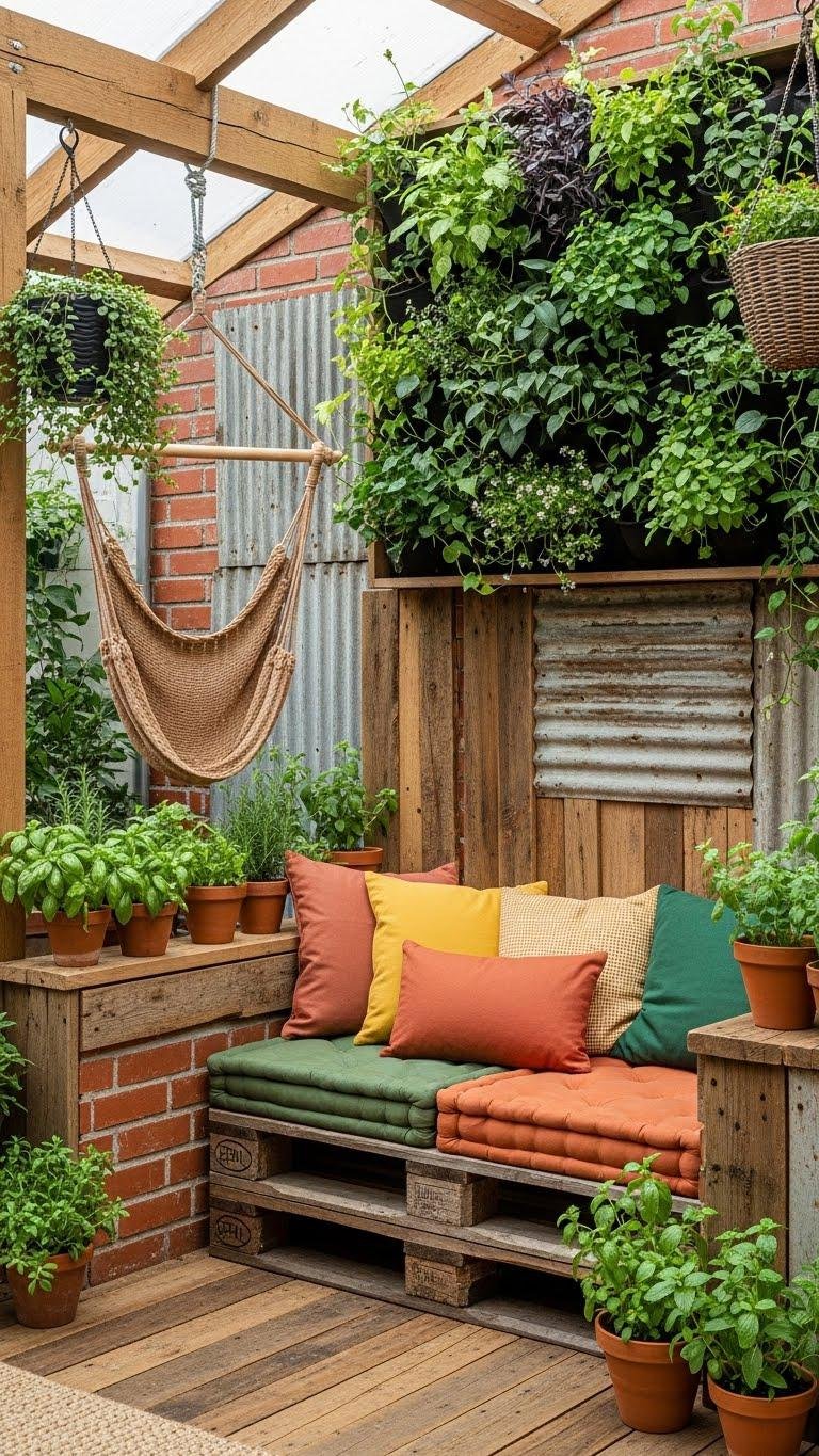 Scavenge a reclaimed palette for a bench, add cushions, hang a compact hammock for drifting afternoons, and border with pots of herbs.