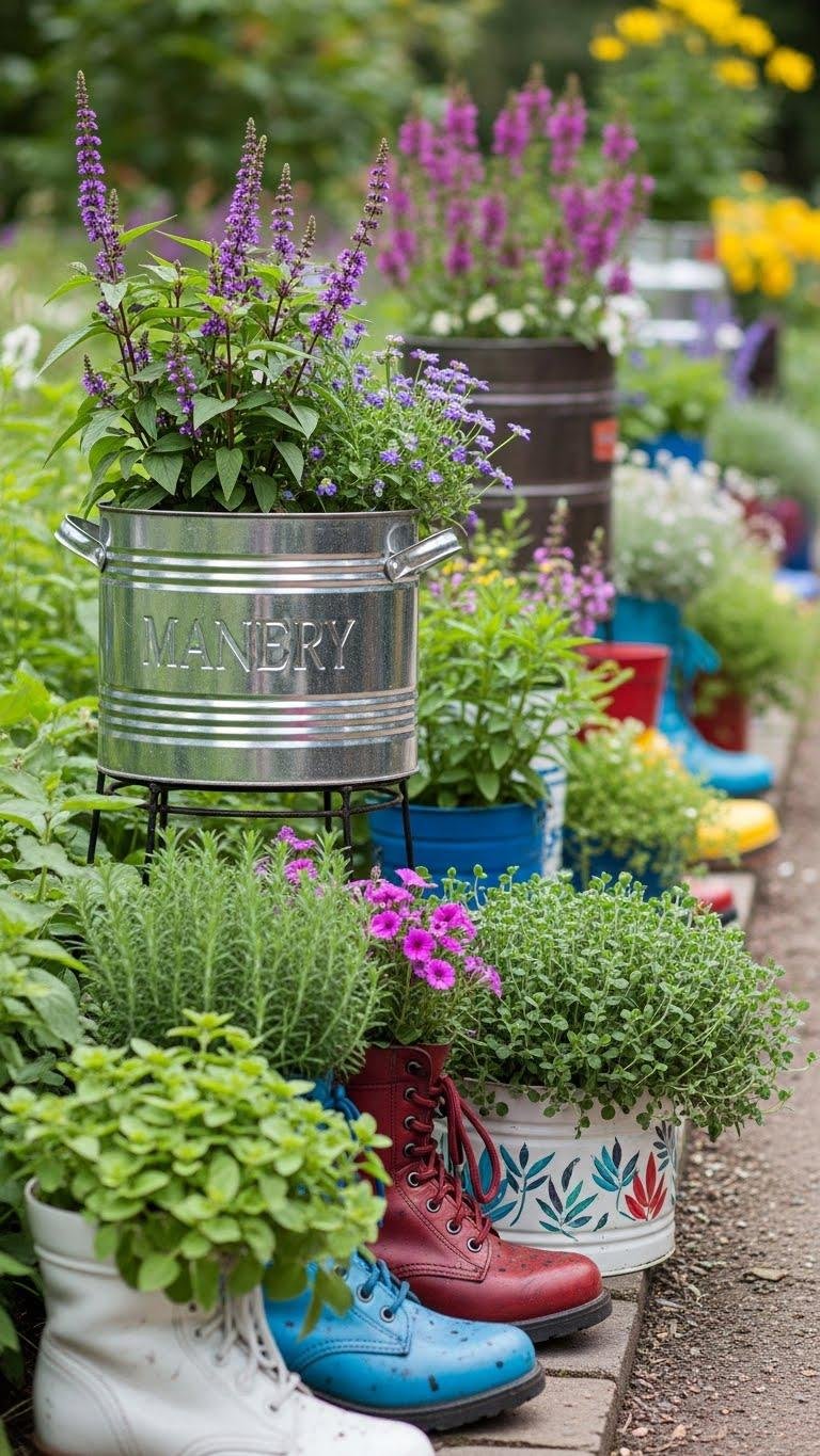 Give an old collection of mismatched containers new life by arranging upcycled planters into a striking focal border that frames a path or lawn edge. Mix vintage tin planters with painted boot pots, varying heights and textures. Plant low, flowing herbs and bold perennials for color and scent.