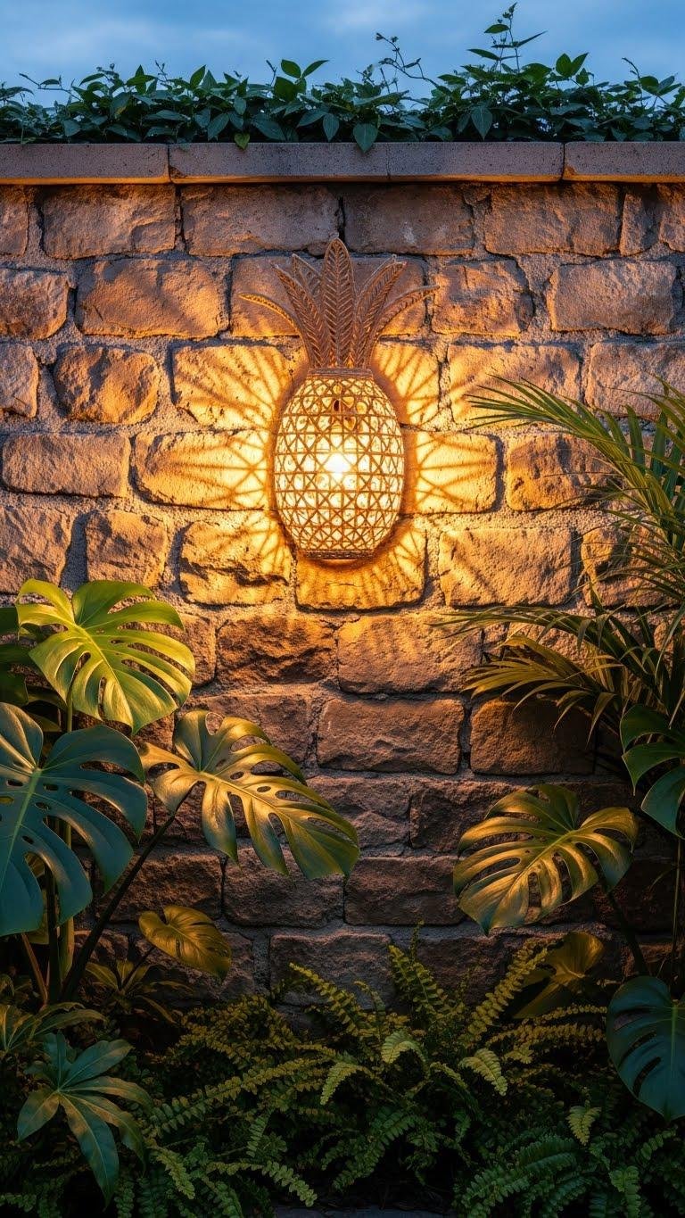 A pineapple-shaped rattan wall sconce brings tropical charm and warm, textured lighting to your garden wall; you’ll enjoy how its woven silhouette casts intricate shadows while resisting outdoor wear.