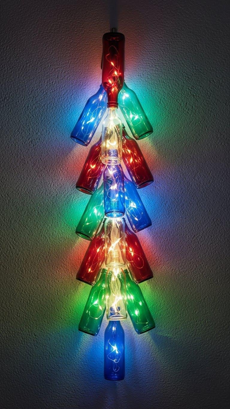 Gather a handful of discarded glass bottles and turn them into a clustered seaglass sconce that scatters soft, jewel-toned light across your garden wall. You’ll clean, do seaglass polishing for smooth edges, drill neat holes, and plan bottle hanging lengths. Mount a simple frame, thread fairy LEDs through necks, and arrange colors for layered glow—functional, free, and handcrafted.