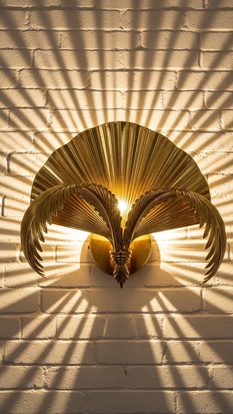 When you pick a polished brass fan-palm wall fixture, you get a statement piece that pairs tropical flair with refined shine; its sculpted palm fronds curl around a low-profile light to cast patterned highlights on brick or stucco.
