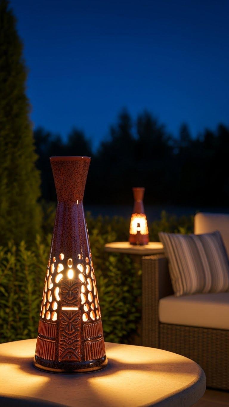 When you mount a ceramic tiki torch–style fixture, think of it as both sculpture and light: choose a hand-glazed terracotta or stoneware body with a tapered neck that funnels light upward while resisting outdoor weather.