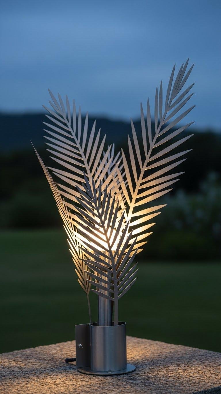 For a sleek, weatherproof accent that reads like sculpture at twilight, cut palm-frond silhouettes from 16‑gauge stainless steel and bend each frond slightly to catch the light.
