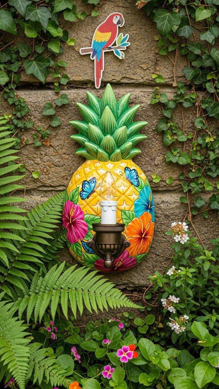 Create a custom painted pineapple ceramic sconce to bring a playful, tropical accent to your garden walls without sacrificing durability. You’ll prep, sand, and prime the ceramic, then hand-paint vibrant tones, seal with acrylic lacquer, and mount a weatherproof socket. Add vintage decals sparingly for character. You’ll balance color, texture, and fastening so the piece feels free, sturdy, and intentionally stylish.
