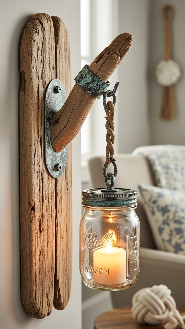 If you want softer, more organic lighting after the sharp silhouettes of the palm spotlight, mount a weathered driftwood backplate and hang a mason jar lantern from its grainy contours.