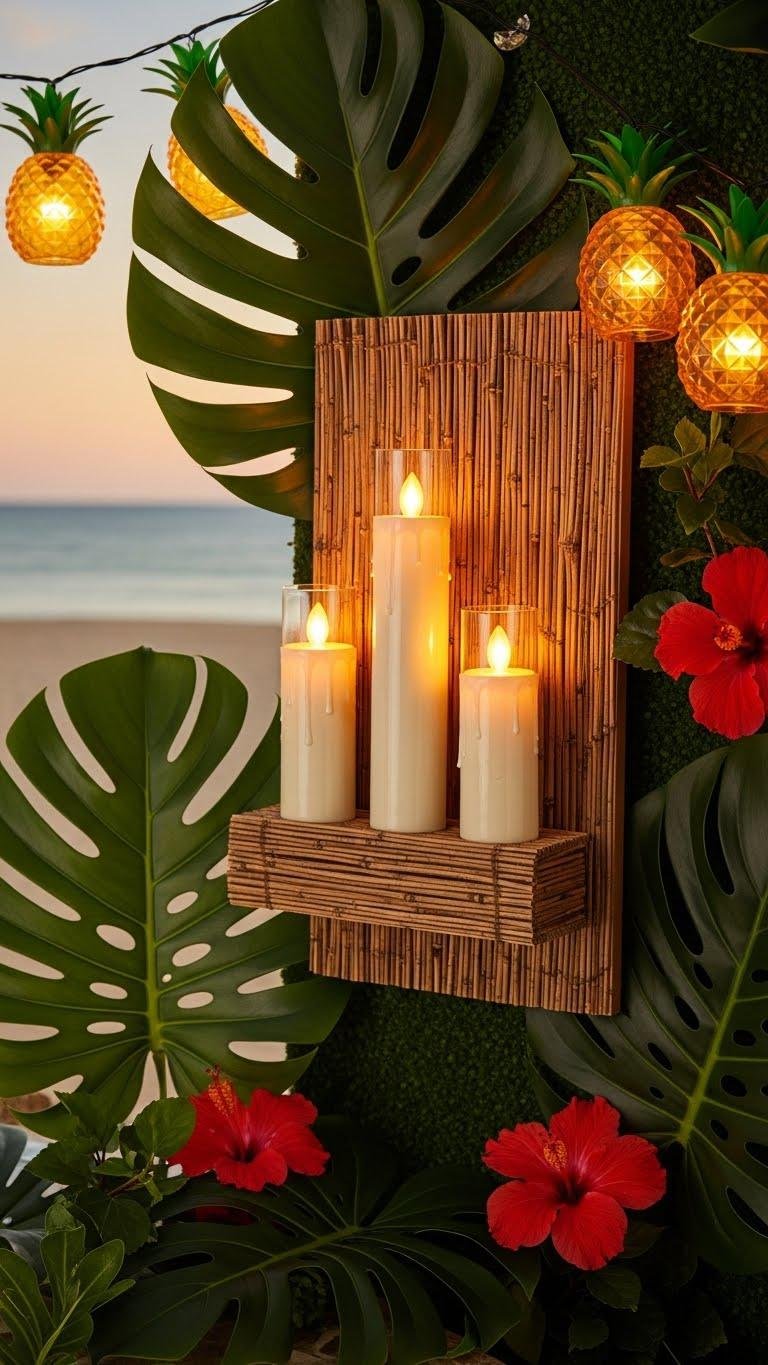 You’ll mount a textured bamboo or rattan backplate, attach weatherproof LED candles, and aim for tiki ambiance with staggered heights.