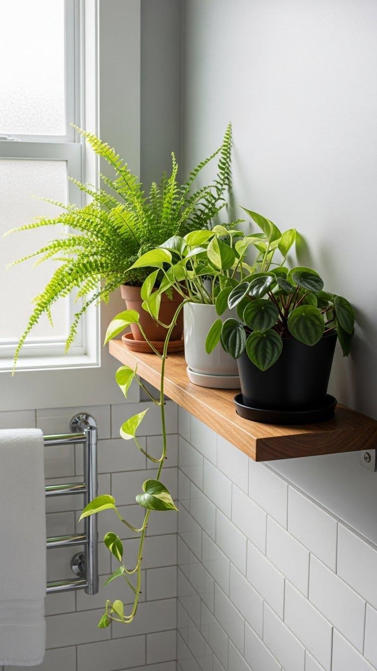 Moving your eye from hanging macramé’s sculptural airiness, think about squeezing green life into tighter, steamier spots: a narrow shelf built for bathroom-ready plants. You’ll favor humidity tolerant foliage—ferns, pothos, peperomia—lined on a slim ledge.