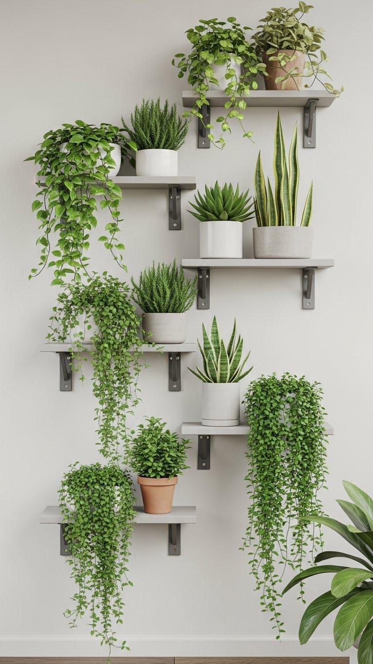 Because staggered floating planter ledges step your eye upward, you’ll get layered greenery without taking floor space.