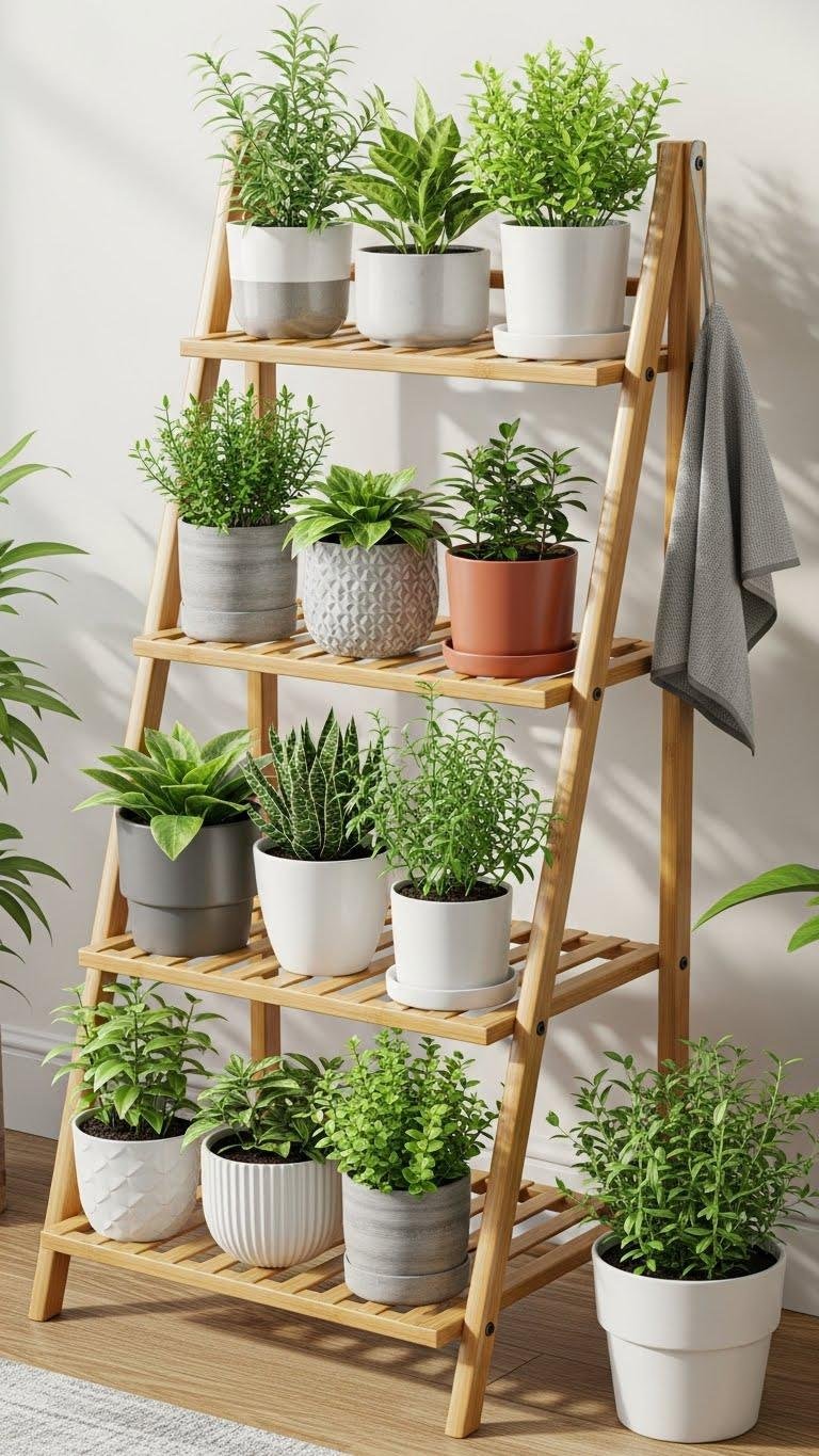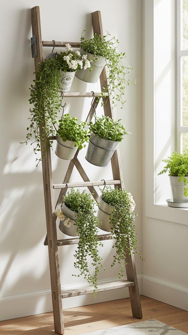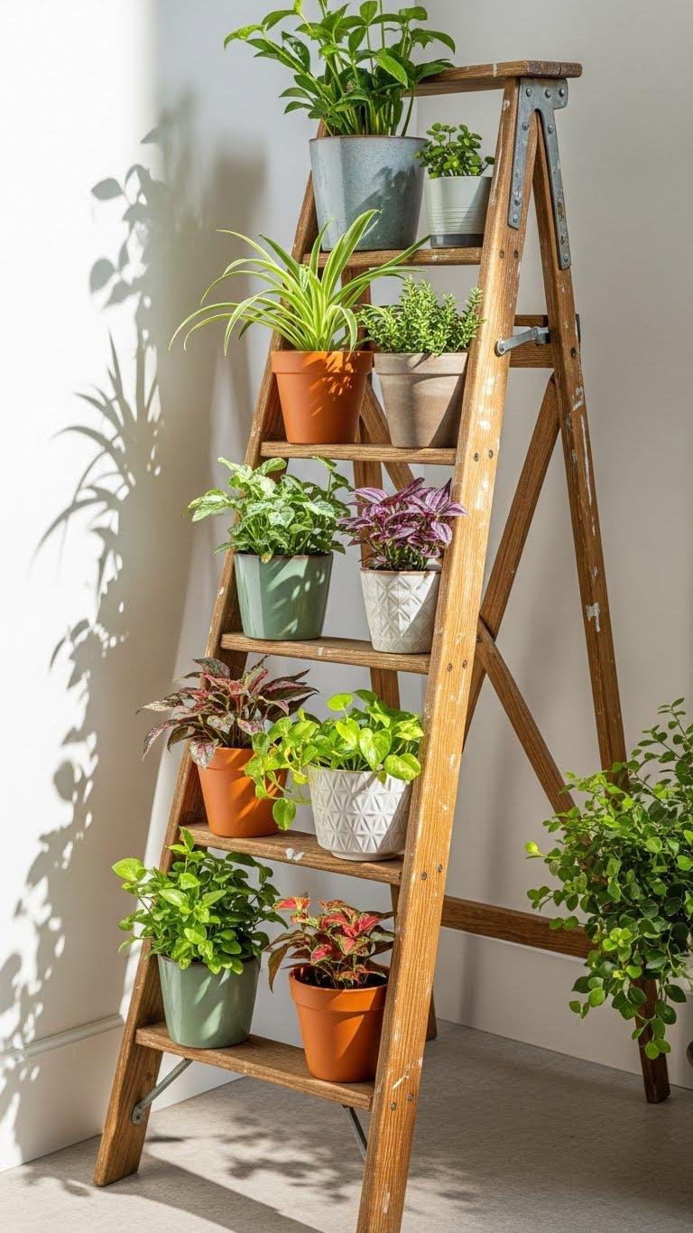 After your eye travels up staggered ledges, a vintage ladder repurposed as a plant rack offers a different kind of vertical charm—you get tiered display with personality and easy access.