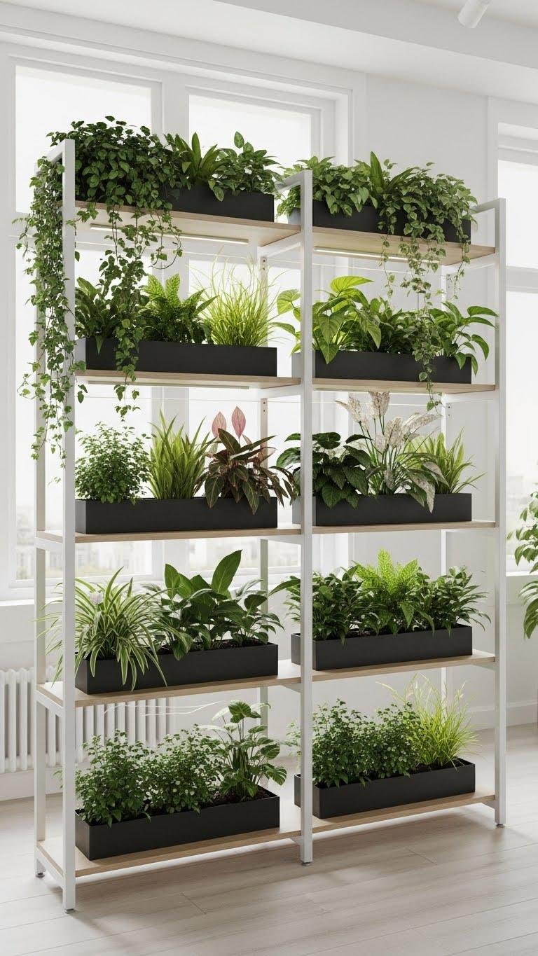 Tall open shelving makes a striking green room divider—slotting plants into airy tiers so light passes through while you carve out separate zones.
