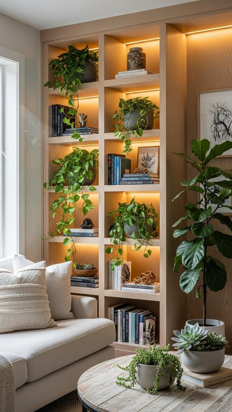 If you like the airflow and easy care of wire tiers but want a cozier, more finished look, a built-in bookcase with integrated plant nooks brings greenery into your living space without sacrificing function.
