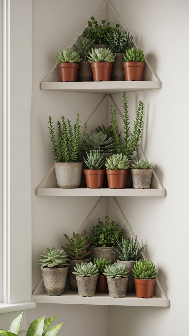 You can move from corner-mounted succulents to a more linear, sculptural display by arranging a mix-and-match collection of ceramic pots on reclaimed wood planks. Choose varied glazed textures and heights, then group by temperate clustering to suggest movement.