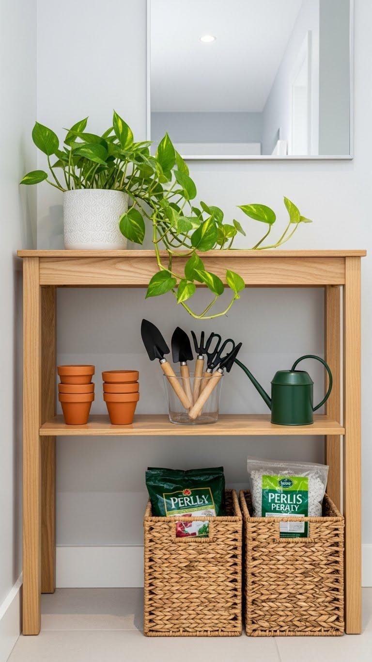 You’ll display trailing pothos on top, tuck pots and tools on the under-shelf, and keep pathways clear.