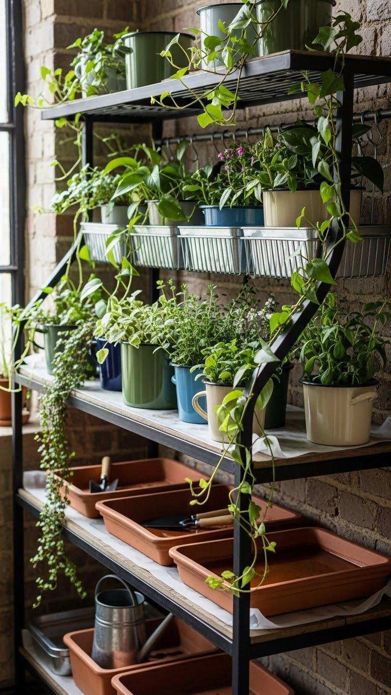 Think vintage greenhouse charm—mix climbing vines, clay trays, and a waterproof liner. Anchor to studs, wipe rust spots, and rotate plants for even light.