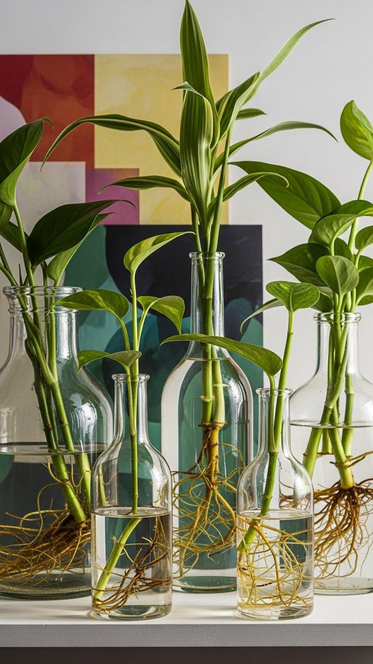Layer layered art with glass propagation vases to turn cuttings into a living display that’s both decorative and functional.