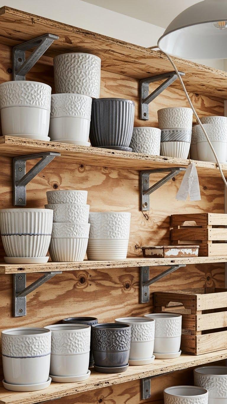 Rustic Plywood Shelving With Ceramic Planters