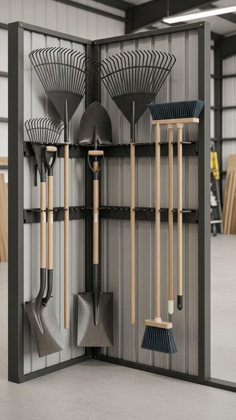Maximize that unused corner of your shed with a heavy‑duty steel corner tool organizer that keeps rakes, shovels, hoes and brooms upright and accessible.