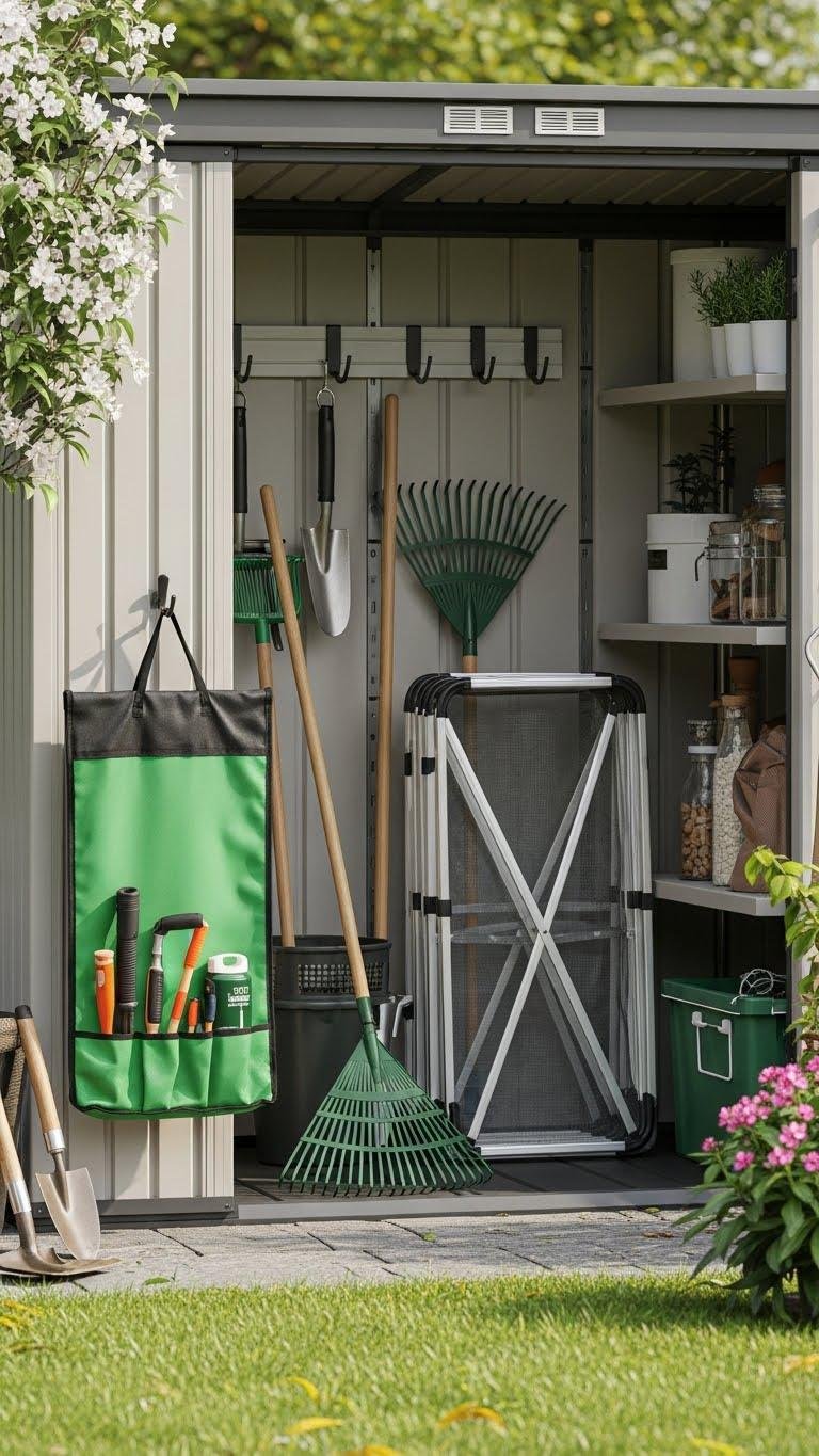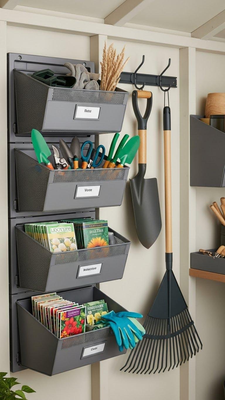 Bring order to your shed by adding integrated hanging baskets and bins that keep small tools, gloves, and seed packets visible and off the floor.