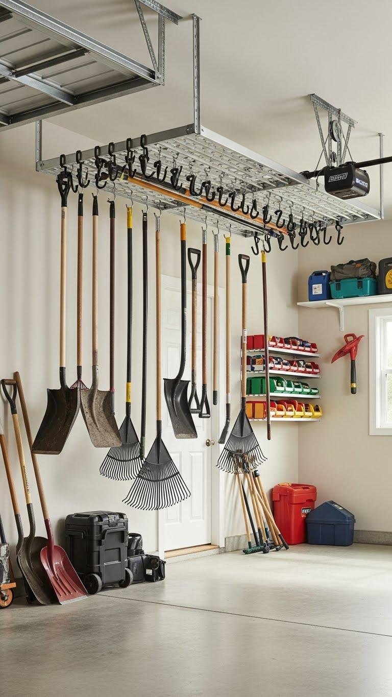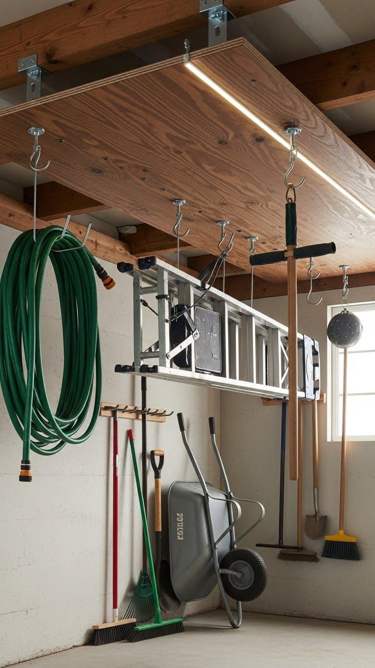 Mounted up out of the way, a plywood panel on the ceiling with screwed-in hooks gives you high-capacity, visible storage for bulky garden gear—you’ll hang ladders, hoses, wheelbarrow handles, and seasonal tools to free floor space.