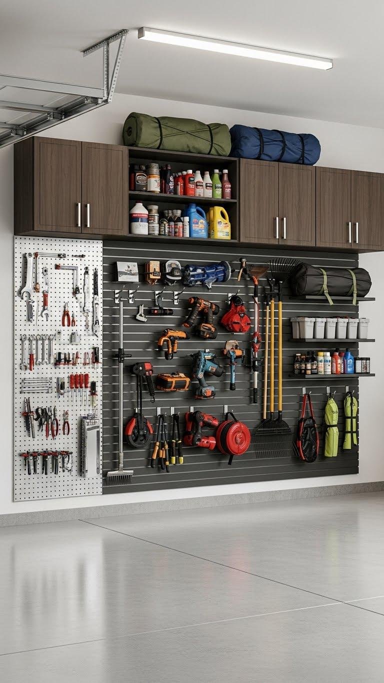 Mount a vertical slatboard for adjustable hooks, add magnetic pegs for small metal tools, and install lockable cabinets for bulky supplies. This setup frees you to grab gear fast, reclaim floor space, and keep the garage tidy.