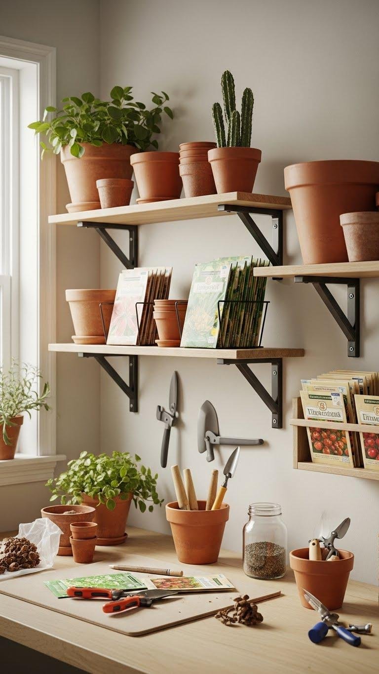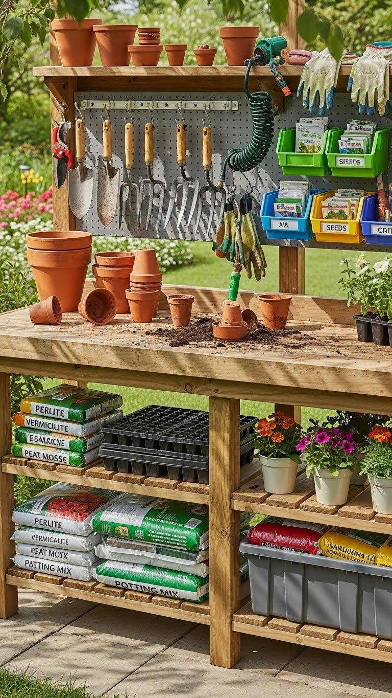 Set up a sturdy potting bench with open shelves above and hooks along the backboard so you can pot, store, and grab supplies without wasting steps. Lay out a space saving pegboard for hand tools, add bins for seed packets, and keep soil bags in weatherproof storage below.