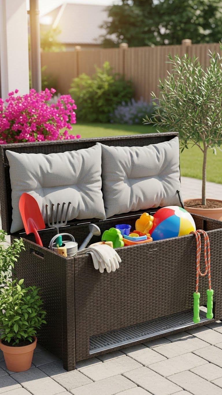 Flip open a deck box and you’ll find seating for two plus hidden storage that keeps cushions, toys, and garden gear out of sight but within reach.