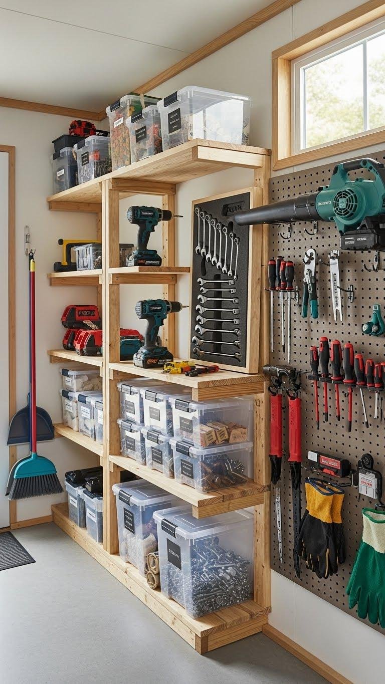 You’ve got tools everywhere — leaning, cluttered, underfoot — and they slow you down. Try streamlined fixes that reclaim floor space, protect metal and wood, and make gear grab‑and‑go: corner stands, wall panels with adjustable hooks, overhead mounts, stackable crates and lockable cabinets. Practical, inexpensive setups fit any shed or garage, and a few smart hacks will change how you work — keep going to see which one fits your space.