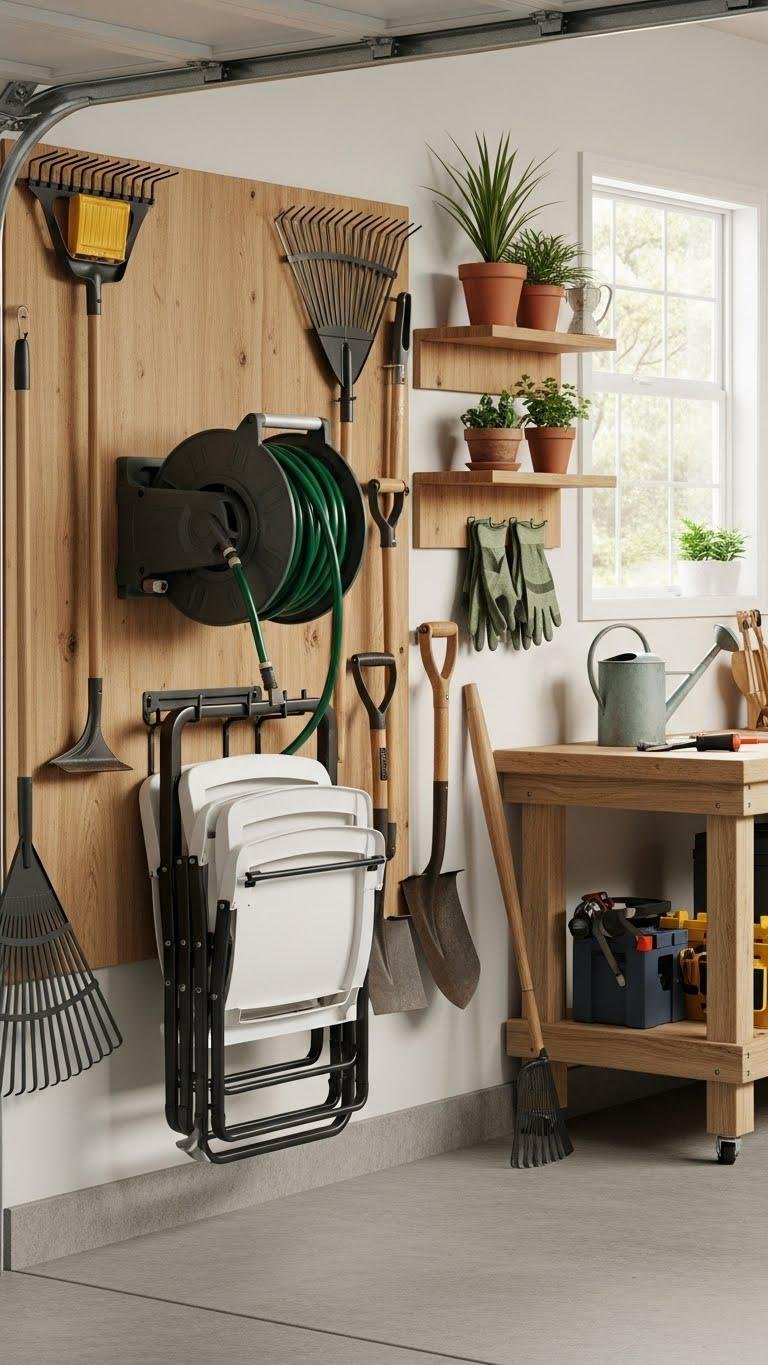 Mount a compact hose reel for tangle-free watering and add a foldable chair hanger to stack seats vertically.