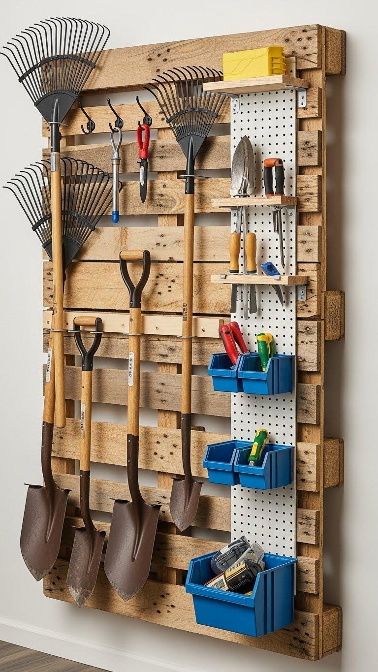 A wall-mounted pallet tool wall turns a reclaimed pallet into a compact, vertical organizer you can customize for rakes, shovels, hand tools and small bins. Mount it at comfortable height, add hooks, a vertical pegboard strip and small shelves.