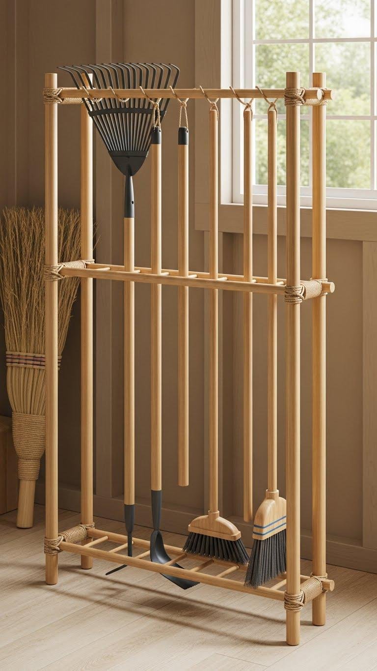 Using simple bamboo poles lashed with twine, you can build a lightweight, adjustable rack that keeps long-handled tools off the floor and easy to reach.