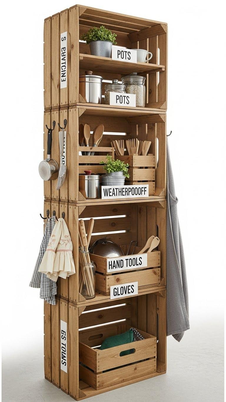 You’ll anchor, sand, and apply weatherproof finishes, then arrange crates in vertical stacking configurations for open shelves. Label, add hooks, and slide in pots, hand tools, and gloves so you can grab freedom fast.