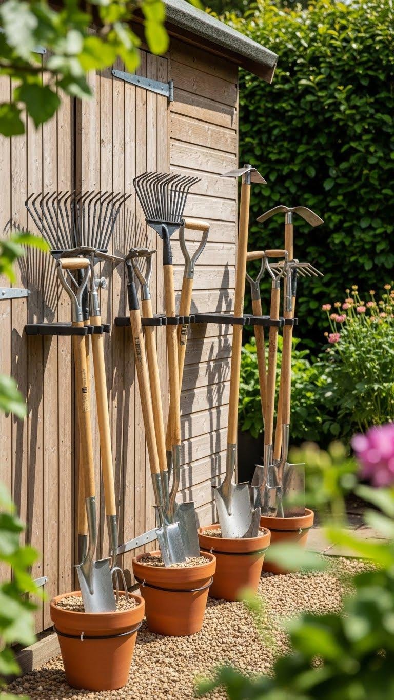 You’ll push vertical stakes through gravel or sand into a weighted base, then lean rakes, hoes and shovels against them. They’re portable, simple to arrange around the shed, and let you grab tools quickly so you can get back to gardening freedom.