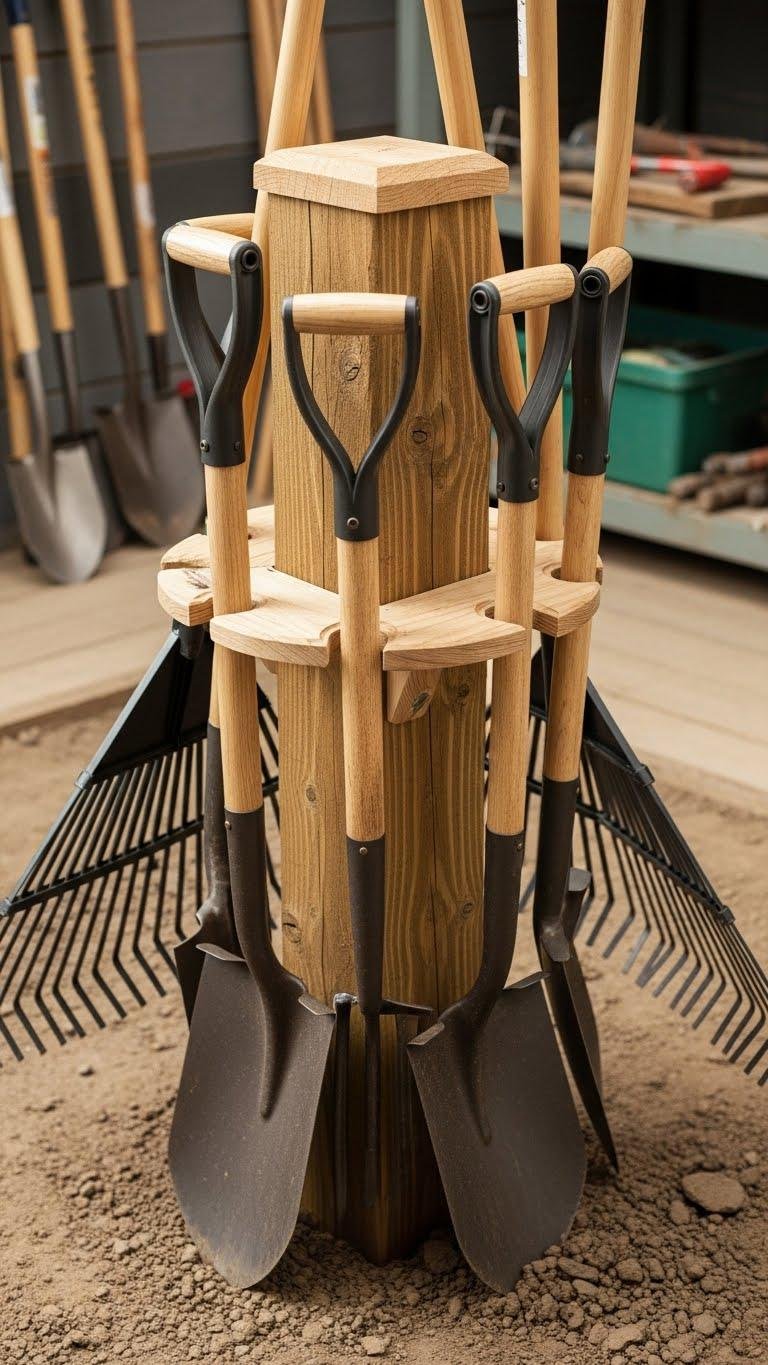 Slide tools around the rustic posthole base, cap the top for safety, and use a buried handleshield—simple carved slots—to cradle shovels and rakes.
