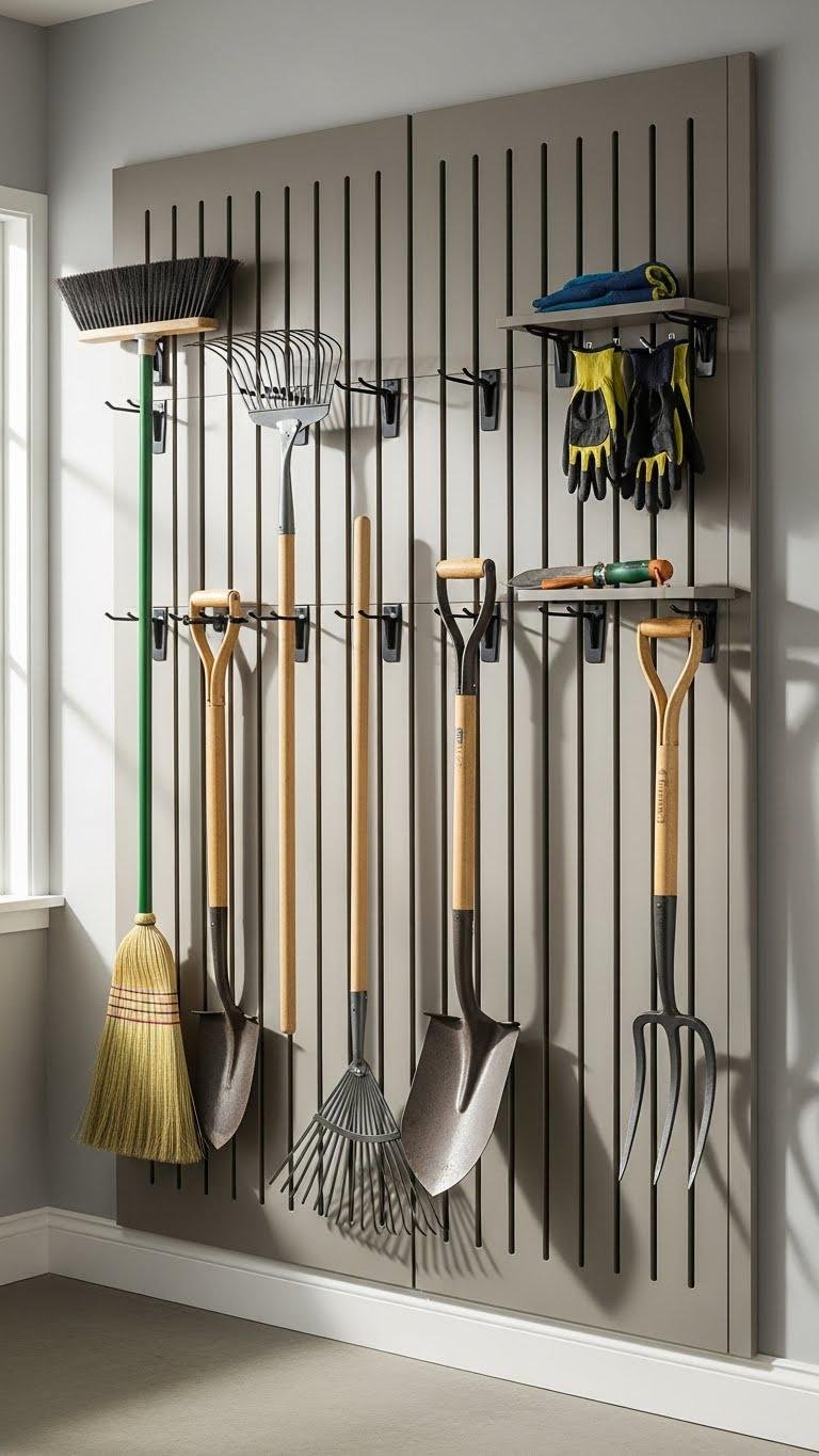 Moving from a simple in‑ground post to a wall-mounted approach, a slatwall panel system gives you organized, adjustable storage for long-handled tools without taking up floor space.